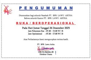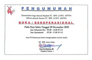 PENGUMUMAN Diumumkan bagi seluruh Nasabah PT. BPR LAWU ARTHABahwa seluruh Kantor PT. BPR LAWU ARTHA BUKA / BEROPERASIONAL Pada…